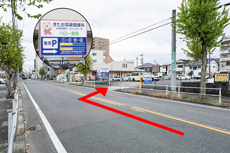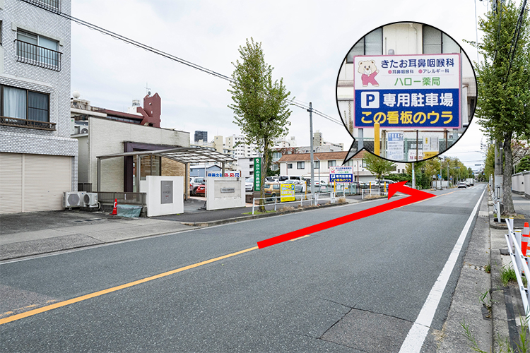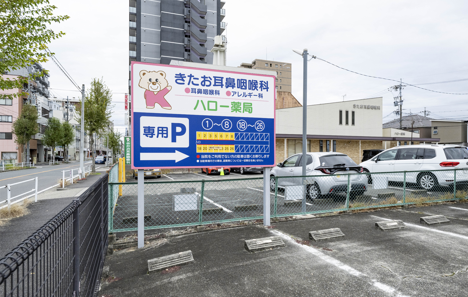 当院を超えたところにある当院駐車場の看板奥の駐車場①~⑧、⑱~㉖です。